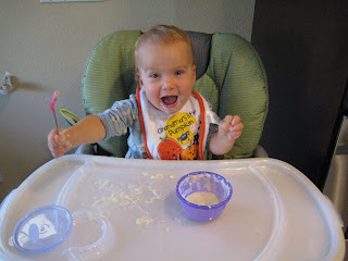 It kills me, but all the parenting books and magazine say I should let Carson feed himself. He certainly enjoys it, but it is ridiculously messy! I'm not sure how much food is actually making it into his mouth so we just let him feed himself occasionally for now. Life is about to get a whole lot messier!